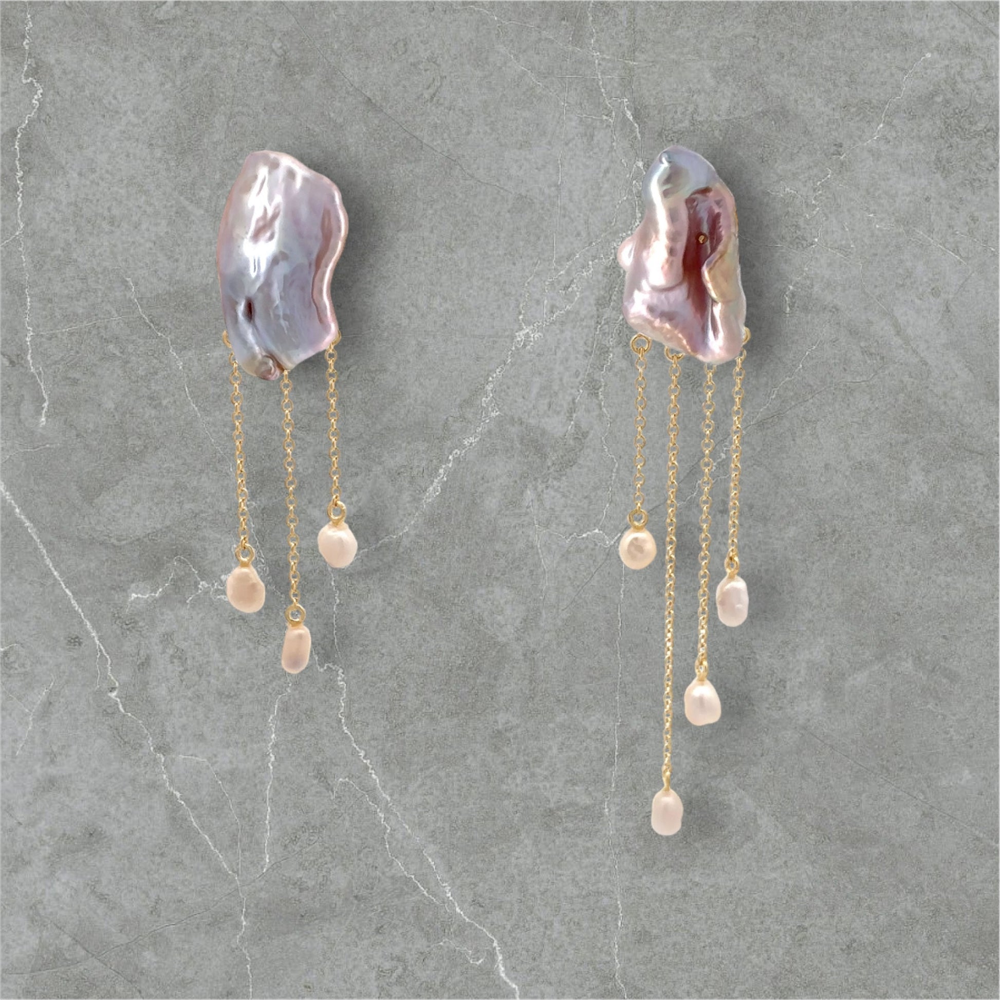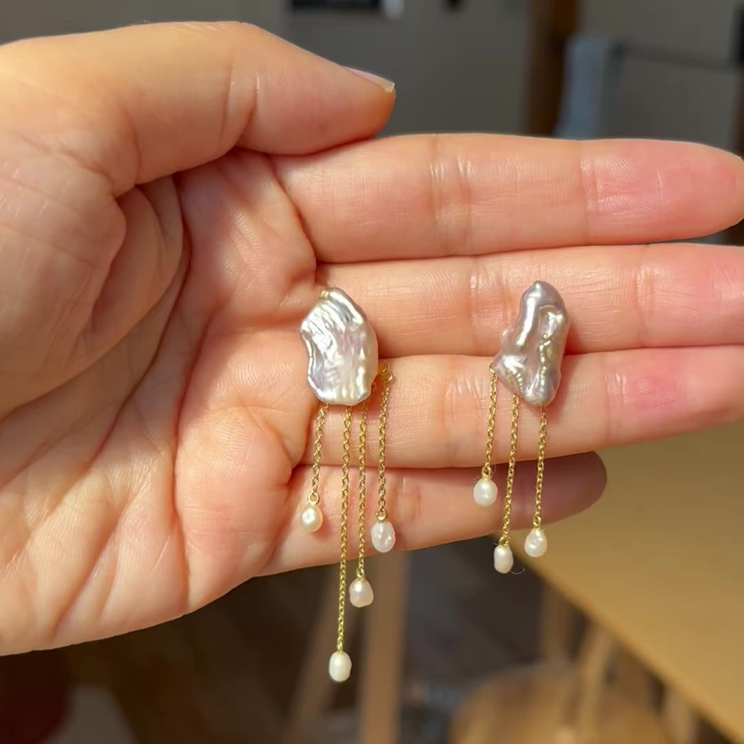 “Shizuku” captures the quiet elegance of water droplets sliding from a smooth surface, mirrored in the soft luster of Biwa pearls. The delicate gold chains sway like ripples on a lake, adding graceful movement and a touch of ethereal beauty.
