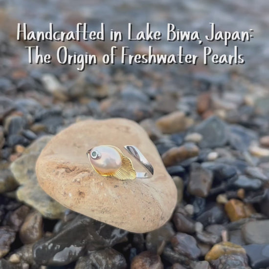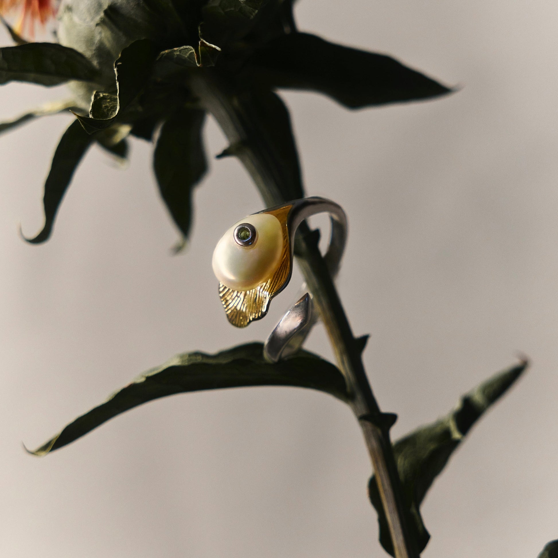 “The Ring” pairs a lustrous pearl and a glimmering green stone on a sterling silver band, evoking an elegant balance of earth and water. Its asymmetrical design and golden accent create a modern yet timeless statement piece for any collection.